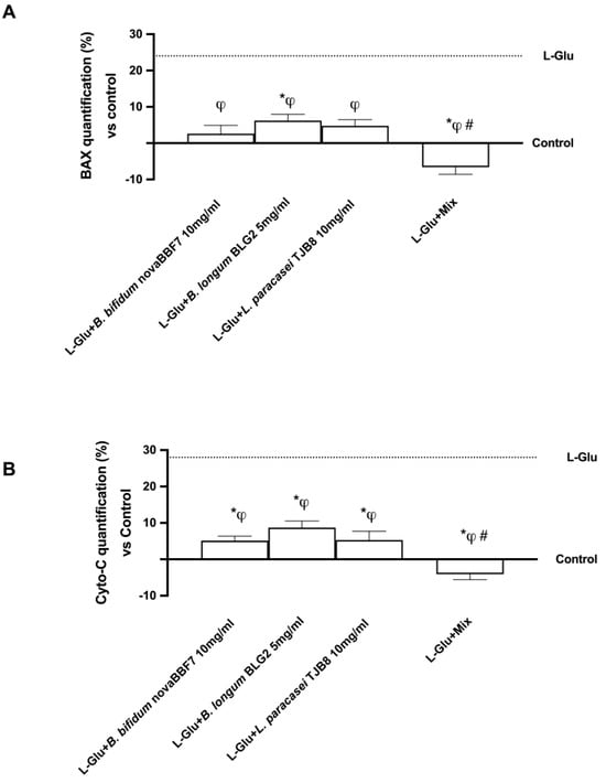 Biological effects of probiotic metabolites on SHSY-5Y in the condition of mood disorders. In (A), BAX protein was evaluated by a specific ELISA Kit, and in (B), released Cyto-C protein was analyzed by MDA ELISA Kit. L-Glu = L-Glutamate 5 mM (dashed line); Mix = B. bifidum novaBBF7 10 mg/mL + B. longum novaBLG2 5 mg/mL + L. paracasei TJB8 10 mg/mL. Data are expressed as mean ± SD (%) of 5 independent experiments normalized to control. * p < 0.05 vs. control; φ p < 0.05 vs. L-Glu; # p < 0.05 vs. single agents.