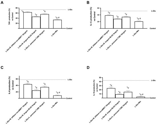 Biological effects of probiotic metabolites on SHSY-5Y in the condition of mood disorders induced by L-Glu (L-Glutamate 5 mM), which is represented in each panel (from A to D) by a dashed line. In (A), TNFα was evaluated by a specific ELISA Kit; in (B), IL-1β production was analyzed by an ELISA Kit; in (C), IL-6 production was evaluated by a specific ELISA Kit; and in (D), IL-10 production was analyzed by an ELISA Kit. L-Glu = L-Glutamate 5 mM (dashed line); Mix = B. bifidum novaBBF7 10 mg/mL + B. longum novaBLG2 5 mg/mL + L. paracasei TJB8 10 mg/mL. Data are expressed as mean ± SD (%) of 5 independent experiments normalized to control. * p < 0.05 vs. control; φ p < 0.05 vs. L-Glu; # p < 0.05 vs. single agents.