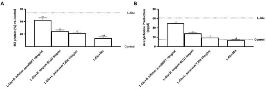 As a result, decreased expression of these receptors may enhance Ach release, and elevated central choline levels have been seen in depressed patients. Finally, the involvement of Muscarinic Acetylcholine Receptor (M2)-AchR levels is explored. M2-AchR protein level and Ach production increased after L-Glu administration, as seen in Figure 6, indicating its effects in generating neuronal injury (p < 0.05). On the other hand, probiotic treatment was able to reverse this condition, decreasing both muscarinic receptor level and Ach production when compared to L-Glu (p < 0.05). However, the maximum effect was observed with Mix (p < 0.05), confirming the cooperative role of these probiotics in modulating the cholinergic system to act in mood mechanisms. Mix reduced the M2 receptor by about 64%, 32%, and 25% compared to B. bifidum novaBBF7, L. longum novaBLG2, and L. paracasei TJB8, respectively (p < 0.05). Mix was also able to lower acetylcholine production by about 72% when compared to B. bifidum novaBBF7, about 48% when compared to B. longum novaBLG2, and about 40% when compared to L. paracasei TJB8 (p < 0.05). These findings suggest that the combination of probiotics operates on the cholinergic system by correcting the in vitro processes behind L-Glu-induced mood disorders via cooperative actions.