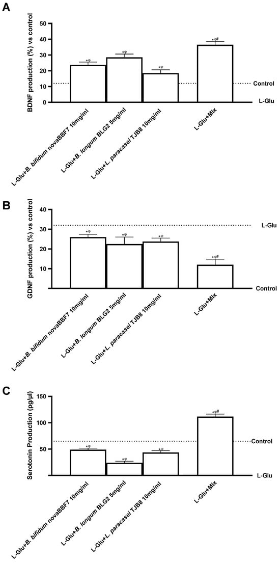 Biological effects of probiotic metabolites on SHSY-5Y in the condition of mood disorders. In (A), BDNF quantification was evaluated by an ELISA Kit; in (B), GDNF quantification was analyzed by an ELISA test; and in (C), serotonin production was analyzed by an ELISA Kit. L-Glu = L-Glutamate 5 mM (dashed line); Mix = B. bifidum novaBBF7 10 mg/mL + B. longum novaBLG2 5 mg/mL + L. paracasei TJB8 10 mg/mL. Data are expressed as mean ± SD (%) of 5 independent experiments normalized to control. * p < 0.05 vs. control; φ p < 0.05 vs. L-Glu; # p < 0.05 vs. single agents.