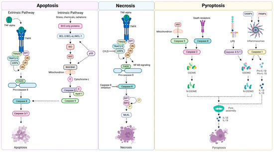 Schematic representation of the main pathways triggering apoptosis, necrosis, and pyroptosis. Abbreviations: Apaf-1, apoptotic protease activating factor 1; BAK, Bcl-2 homologous antagonist/killer; BAX, Bcl-2-associated X-protein; BH3, Bcl-2 homology-3 domain; BID, BH3 interacting-domain death agonist; cIAPs, cellular inhibitor of apoptosis proteins; CYLD, cylindromatosis; DAMPs, damage-associated molecular patterns; FADD, FAS-associated death domain; GSDM, gasdermin; IL, interleukin; LPS, lipopolysaccharide; MLKL, mixed lineage kinase domain-like protein; NF-kB, nuclear factor-kappa B; PAMPs, pathogen-associated molecular pattern molecules; RIP1, receptor interacting protein kinase 1; tBID, truncated BID; TNF, tumor necrosis factor; TNFR, tumor necrosis factor receptor; TRADD, TNFR1-associated death domain protein; TRAF, TNFR associated factor; Ub, ubiquitin. Created with BioRender.com (accessed on 24 April 2024).