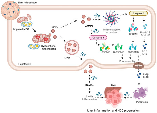 Schematic representation of the molecular routes linking mitochondrial quality control impairment, generation of mitochondria-derived vesicles, and pyroptosis in hepatocarcinoma. Abbreviations: DAMPs, damage-associated molecular patterns; GSDM, gasdermin; HCC, hepatocarcinoma; IL, interleukin; MDVs, mitochondria-derived vesicles; MQC, mitochondrial quality control; MVBs, multivesicular bodies. Created with BioRender.com (accessed on 24 April 2024).