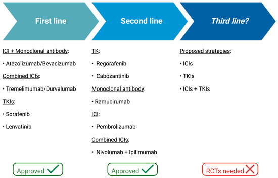Schematic representation of treatment lines for hepatocarcinoma. Abbreviations: ICIs, immune checkpoint inhibitors; RCTs, randomized clinical trials; TKIs, tyrosine kinase inhibitors. Created with BioRender.com (accessed on 24 April 2024).