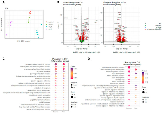 PCA result, differentially expressed genes, and enriched pathways. (A) PCA result visualized by PC1 and PC2 for pterygium groups and control groups in the Asian and the European samples using inflammatory-associated genes from MSigDB. (B) Differentially expressed inflammatory-associated genes in the Asian and the European pterygiums compared to the controls (p-value < 0.05, and log2 fold-change > 0.5). (C) Top 20 most commonly enriched pathways in the Asian and the European pterygiums compared to the controls (p-value < 0.05, and log2 fold-change > 0.25). (D) Top 10 most differentially enriched pathways in the Asian and the European pterygiums compared to the controls (p-value < 0.05, and log2 fold-change > 0.25).