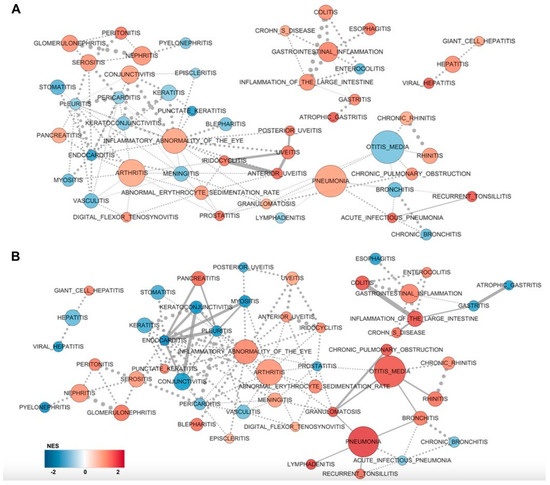 We additionally carried out GSEA to search for interactions between pathways that are known or at least linked in current databases. Pathway connectivity is visualized using Cytoscape in Figure 2A for the European pterygiums and Figure 2B for the Asian pterygiums. In the European pterygiums (Figure 2A), although inflammation-associated nodes involved in several diseases (other than eye-associated conditions) were positively and significantly enriched with straight lines (i.e., relatively lower p-values) such as otitis media (inflammation caused by an infection of the middle-ear) or colitis (inflammation in the colon), eye-associated inflammatory terms were also partially at least connected (i.e., relatively higher p-values).