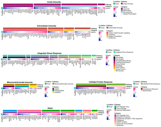 To better understand how the transcriptional profiles of our Asian datasets were directly associated with inflammatory responses, we explored the relative gene expression levels of the customized inflammatory gene lists obtained from [12] (Figure 3). The gene list is composed of six different categories, where three of them (i.e., innate immunity, extracellular immunity, and mitochondrial innate immunity) are typical systems intimately associated with inflammatory responses, and the other three (i.e., integrated stress responses, renin–angiotensin–aldosterone system, and unfolded protein responses) are additional systems indirectly involved in cellular stresses. As initially designed in this study, we primarily focused on gene expression profile alterations associated with various inflammatory responses. Among the list of genes with significant up/downregulations in Asian pterygiums, the eye-associated inflammatory gene list included (i) the upregulation of CSF3, a cytokine linked to increased pain perception in the contralateral eye post-cataract surgery, which represented its role in inflammatory responses [13]; (ii) the upregulation of SOCS1, which indicated an association with modulating ocular inflammation, as observed in intraocular inflammatory diseases like uveitis and scleritis [14]; (iii) the upregulation of HLA-A in ocular diseases, which demonstrated its role in increasing the risk of ocular lesions in Behçet’s disease [15]; (iv) the upregulation of CD38, which corresponds with findings from retinal ischemia/reperfusion injury studies, where a deficiency in CD38 was shown to confer protective effects against inflammatory responses on the retina [16]; (v) the upregulation of JUN in glaucoma, which displayed its involvement in retinal ganglion cell (RGC) degeneration through the JNK-JUN signaling pathway [17]; (vi) the upregulation of PYCARD, coupled with the downregulation of NLRP3, which highlighted the significance of the NLRP3 inflammasome and PYCARD in IL-1β production in the eye [18]; (vii) the upregulation of TNFRSF10B and downregulation of TNFSF10, which may express a complex interplay in retinal degenerative disorders of age-related macular degeneration (AMD), where TNFSF10 and its receptor TNFRSF10B are involved in inflammatory and apoptotic pathways [19]; (viii) the upregulation of SERPING1, whose genetic variations can be significant contributors to AMD susceptibility [20]; (ix) the upregulation of CXCL8, alongside the downregulation of IL6, known to be associated with inflammatory responses mediated by CXCR1 and CXCR2 receptors [21], which turned out to be important in ocular inflammation and angiogenesis [22]; (x) the downregulation of CXCL11, involved in the inflammatory processes of AMD, which was found to be linked to the retinal pigment epithelium’s (RPE’s) responses [23].
