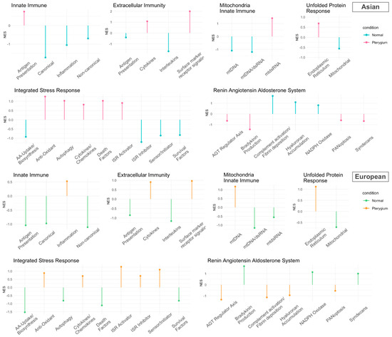 Lollipop plot using fGSEA with inflammatory genes customized by Topper and Guarnieri et al. (2023) [33] in the Asian and European pterygium groups compared to their control groups. The NESs were computed with the core inflammatory genes (p-value < 0.5).