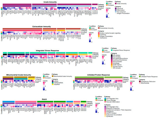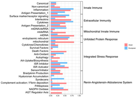 To search more extensively for inflammatory-based regulations of genes or modules, we compared alteration patterns of the core genes or their modules (i.e., gene groups) between the Asian and the European pterygiums. As depicted in Figure 4 and Figure 5, the inflammatory pathways with the most similar patterns of gene expression alterations between the two ethnic groups turned out to be extracellular immunity and UPR. In these pathways, cytokines, surface marker receptor signaling, and the endoplasmic reticulum were positively enriched, while antigen presentation, interleukins, and mitochondrial modules were negatively enriched. RAAS and ISR displayed significantly enriched alterations in opposite patterns between the two datasets. Specifically, bradykinin production, complement activation/fibrin deposition, and hyaluronan accumulation in RAAS and death factors in ISR demonstrated contrasting enrichment.