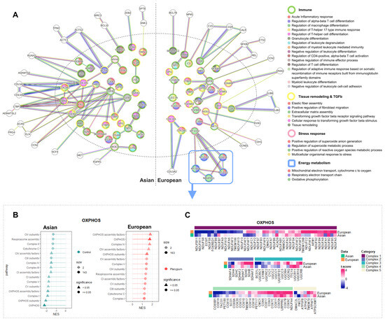 Functional differences with different activity levels in Asian and European pterygiums compared to their controls. (A) PPI network with significantly differentially expressed inflammatory genes. (B) Lollipop plot of oxidative phosphorylation. (C) Heatmap of oxidative phosphorylation. The inflammatory genes from MSigDB were filtered with adjusted p-value < 0.2 and |log2 fold change| > 0.5 for Asian, and adjusted p-value < 0.001 and |log2 fold change| > 2.25 for European. The proteins in the PPI network were exhibited by applying confidence 0.9. The enriched pathways were selected with strength 0.75 for Gene Ontology biological processes.