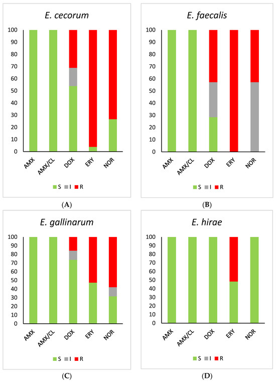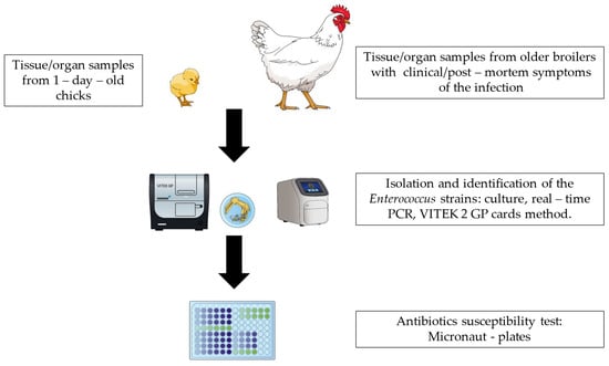 - Bzdil, J.; Sladecek, V.; Senk, D.; Stolar, P.; Waicova, Z.; Kollertova, N.; Zouharova, M.; Matiaskova, K.; Linhart, P.; Nedbalcova, K. Enterococci Isolated from One-Day-Old Chickens and Their Phenotypic Susceptibility to Antimicrobials in the Czech Republic. Antibiotics 2023, 12, 1487. [Google Scholar] [CrossRef] [PubMed]
