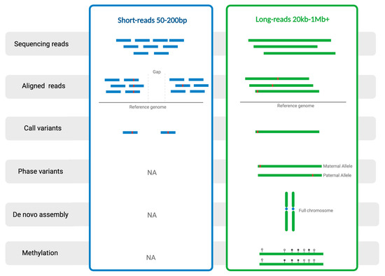 Comparison of the capabilities of short- and long-read sequencing technologies. The left panel displays short blue lines representing reads from short-read sequencing, and the right panel displays long green lines representing reads from long-read sequencing (except for the two vertical green lines which represent a homologous chromosome). The red lines on some of the reads are variants. Adapted from Kono and Arakawa [15]. Created with BioRender.com (accessed on 16 January 2024).