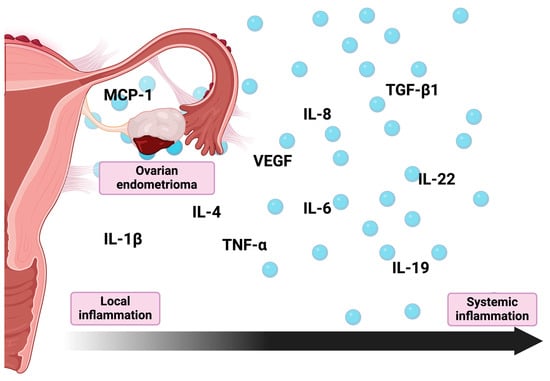 Evaluation of cystic fluid revealed increased VEGF levels within endometrial cyst fluid, which not only further confirmed the observed local inflammation but also pointed to the role of the increased angiogenesis of endometriotic tissues potentially contributing to their growth and development []. Moreover, evaluation of biopsies of unaffected peritoneum taken from patients diagnosed with endometriomas revealed increased VEGF immunoreactivity compared to the control group, with a positive correlation observed between the size of the endometrioma and intensity of VEGF labeling []. As suggested, it might be related to an increase in VEGF production by activated endometrioma-associated macrophages []. Due to VEGF being a proinflammatory factor responsible for increasing endothelial permeability, increased VEGF immunoreactivity in the peritoneum might be associated with concurrent inflammation of the peritoneum, even when it is not affected by endometriosis []. Kajdos et al. highlighted elevated levels of microvesicles containing VEGF in the blood serum of patients diagnosed with endometriomas. This finding aligned with the majority of reports suggesting systemic inflammation concurrently occurring with endometriomas []. Of particular interest, Tan et al. presented findings that partially contradicted the previously described data. Their report indicated that VEGF levels within endometrial tissue are even lower than those observed in the eutopic endometrium [].