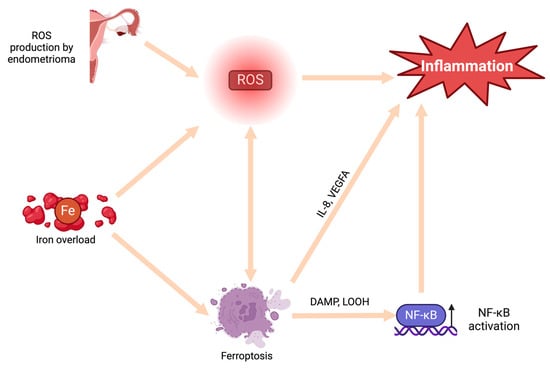 Accumulation of menstruation-like blood within the endometrioma creates a highly proinflammatory environment, primarily attributed to the presence of iron [,]. Iron is known to catalyze the generation of ROS, thereby inducing oxidative stress within the endometrioma and surrounding tissues []. However, the proinflammatory effects of iron are not limited to only generation of ROS. Iron overload has been linked to ferroptosis, an intracellular iron-dependent form of cell death [,,]. This process involves the release of damage-associated molecular patterns (DAMPs) and lipid peroxidation products, which in turn activate the NF-κB pathway, leading to inflammation []. Furthermore, iron overload has been correlated with increased levels of vascular endothelial growth factor A (VEGFA) and IL-8, proinflammatory cytokines described above, thus triggering inflammation through an additional mechanism [,,]. However, the age of lesions directly correlates with the level of iron accumulation and, consequently, the severity of iron-associated complications []. There is suspicion that, over time, iron overload escalates, exacerbating the severity of associated issues. Finally, examination of cyst fluid has revealed an association between iron levels and infertility related to endometriosis []. Therefore, cyst fluid iron levels could serve not only as markers of inflammation but also as predictors of infertility in women with ovarian endometriomas [,] (Figure 2).
