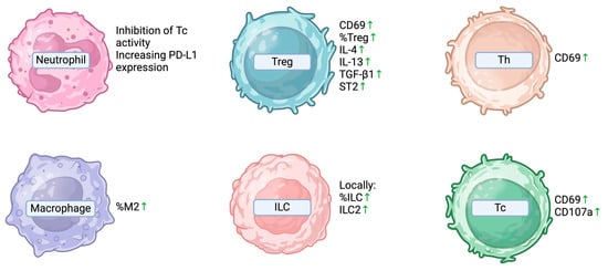 A research group conducted an evaluation of surface markers, including RAGE, TLR-4 (recognizing HMGB1), the co-stimulation marker CD86, the activation marker CD69, and the degranulation marker CD107a, on various cells from tissue samples obtained from patients with ovarian endometriomas and those with other benign ovarian tumors. The expression of the mentioned molecules did not differ significantly on dendritic cells (DCs), macrophages, NK cells, or invariant natural killer T (iNKT) cells between the two groups. However, the expression of CD69 on both T helper (Th) and cytotoxic (Tc) lymphocytes, as well as CD107a on Tc lymphocytes, was found to be elevated in women with endometriomas. Moreover, the researchers observed that CD8+ T and CD4+ T cells were upregulated as the levels of HMGB1 (one of the damage-associated molecular patterns, or DAMPs) increased in women with endometriomas. This led the authors to suggest that the role of the adaptive immune system might be more pronounced in endometrial cysts compared to the innate immune response. In a detailed assessment, the authors described a higher percentage of M2-polarized macrophages (the M2 subtype promotes the Th2 response dependent immunosuppressive effects) and regulatory T lymphocytes in the group of women with endometrial cysts. Both of these parameters increased with HMGB1 upregulation []. In a mouse model of endometrioma, the authors reported that ectopic endometrial CD4+ T cells demonstrated an enhanced capacity to produce proinflammatory cytokines and exhibited upregulated proapoptotic and proinflammatory signaling pathways, such as IL-17 and TNF. Moreover, these cells seemed to be the primary source of the previously mentioned IL-16 in ovarian endometriosis, thus suggesting their pivotal role in the pathogenesis of the endometrioma [].