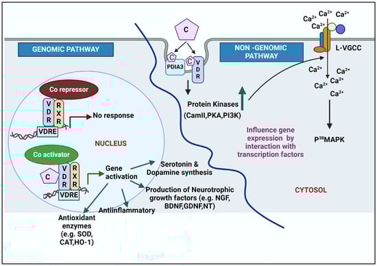 The active form of vitamin D is calcitriol, which has a crucial role in brain development and neuroprotection. Calcitriol exerts its action by binding to VDR through genomic (classical) pathways (slow response) or non-genomic pathways (rapid response) (Figure 2).
