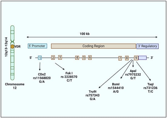 Several single nucleotide polymorphisms (SNPs) have been identified in the VDR gene with roles in various disease conditions. But VDR gene polymorphisms in most cases do not affect VDR function, as they do not result in an amino acid change. The main VDR SNPs studied in relation to AD are ApaI, TaqI, BsmI, and FokI, which lead to changes in vitamin D utilization, leading to increased neurodegeneration []. ApaI (rs7975232; intron 8; G to T polymorphism), TaqI (rs731236; exon 9; T to C polymorphism), and BsmI (rs1544410; intron 8; A to G polymorphism) are 3′ UTR polymorphisms that increase mRNA stability. The FokI (rs2228570; exon 2; C to T polymorphism) polymorphism alters the gene’s initiation sites and modifies the protein’s structure by extending its length by three amino acids. As a result, two VDR variants exist, and the long version of VDR is called M1 (methionine at first position; T-allele or the f allele), while the short form is referred to as M4 (methionine at fourth position; C-allele or F allele). The Cdx2 (rs11568820; promoter region; A to G polymorphism) polymorphism might affect the transcriptional activity [], whereas Tru9I (rs757343; intron 8; G to A polymorphism) is associated with serum vitamin D levels [] (Figure 3).