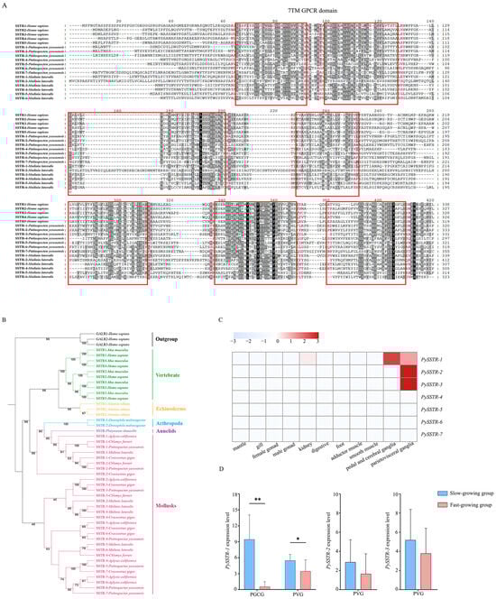 (A) Alignment of amino acid sequences of SSTRs. The black block represents a position where the amino acid is completely conserved across all sequences, denoting a highly conserved region. The dark gray block represents a position where the amino acid is similar in most sequences, indicating a moderate level of conservation. The light gray block indicates a position where the amino acid is mostly similar, but there are some variations. The red boxes indicate the position of seven transmembrane domains. The numbers above the image represent the amount of amino acids in the sequences. (B) The phylogenetic tree of SSTRs in bilaterians with galanin-type receptors (GALRs) as the outgroup. (C) PySSTR expression levels in adult tissues. The expression levels, as represented by TPM values, are shown in the gradient heat map with colors ranging from white (low expression) to red (high expression). (D) Differences in expression of PySSTRs between fast- and slow-growing scallops. * represents p < 0.05 and ** represents p < 0.01.