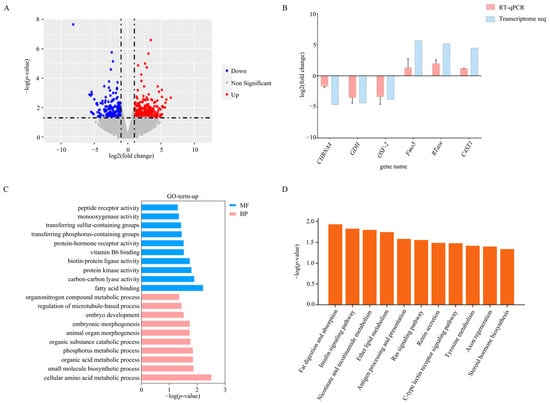 To understand the possible growth regulation pathways that MlSSTR-1 is involved in, the transcriptome of digestive glands of M. lateralis with MlSSTR-1 expression inhibition was analyzed. A total of 442 differentially expressed genes (DEGs) between the control group and RNAi group (log2|FC| > 1, p < 0.05) was obtained, among which, 237 were up-regulated and 205 were down-regulated in the RNAi group (Figure 3A). In the up-regulated genes in RNAi group, 64 genes were annotated, and the fatty acid-binding protein (FABP) was the most significant gene with a p-value of 1 × 10−5. To verify the correctness of the transcriptome analysis, we used qRT-PCR to test the expression changes of six randomly selected DEGs, including three significantly up-regulated genes and three significantly down-regulated genes (Figure 3B). The qRT-PCR results were consistent with those of the transcriptome analysis. We further explored the function of the DEGs through GO enrichment analysis. The results showed that 237 up-regulated DEGs were significantly enriched in 20 terms, and the most significant term was the cellular amino acid metabolic process, followed by fatty acid binding (Figure 3C). The KEGG enrichment analysis showed that the 237 up-regulated DEGs were enriched in 11 pathways, and the most significant pathway was the fat digestion and absorption pathway, followed by the insulin signaling pathway (Figure 3D).