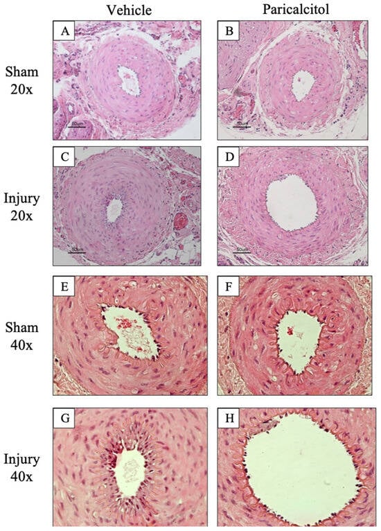 Increased intima–media ratio and stenosis following endothelial injury in rat femoral arteries. Endothelial injury was induced by scraping (injury artery) and a sham control without scraping was obtained from the contralateral artery. One group of rats received paricalcitol (750 ng/kg) and the other received the vehicle for 14 days, and artery samples were evaluated at 14 days. Images represent 20X (A–D) and 40X (E–H) magnification of hematoxylin eosin staining representative samples from the different groups. In panels E–H, intimal hyperplasia delimited by the internal elastic lamina can be better appreciated. Table 1 presents quantitative results for intima–media ratio and % stenosis.