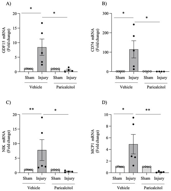 Increased femoral artery gene expression for key molecules: impact of paricalcitol. Arterial injury was associated with an increased mRNA expression of growth factors and inflammatory mediators, and this was prevented by paricalcitol. mRNA expression was studied using RT-qPCR. Data expressed as % increase over the sham artery, which was assigned a value of 100%. (A) GDF15. (B) CD74. (C) NIK. (D) MCP-1. * p < 0.01 vs. injured vehicle; ** p < 0.05 vs. injured vehicle.