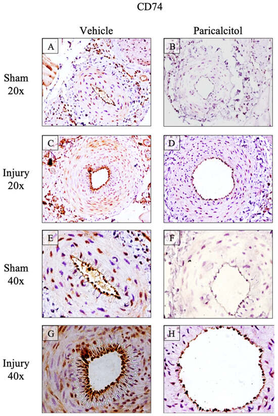 Increased femoral artery CD74 protein expression: impact of paricalcitol. Expression of CD74 in rat femoral arteries. Constitutive CD74 expression is observed in vehicle sham arteries (A,E) and is lower in paricalcitol sham arteries (B,F). CD74 expression increased in injured arteries, both in the media (C) and endothelium (G). Treatment with paricalcitol in injured arteries reduced CD74 expression to basal levels (D,H).