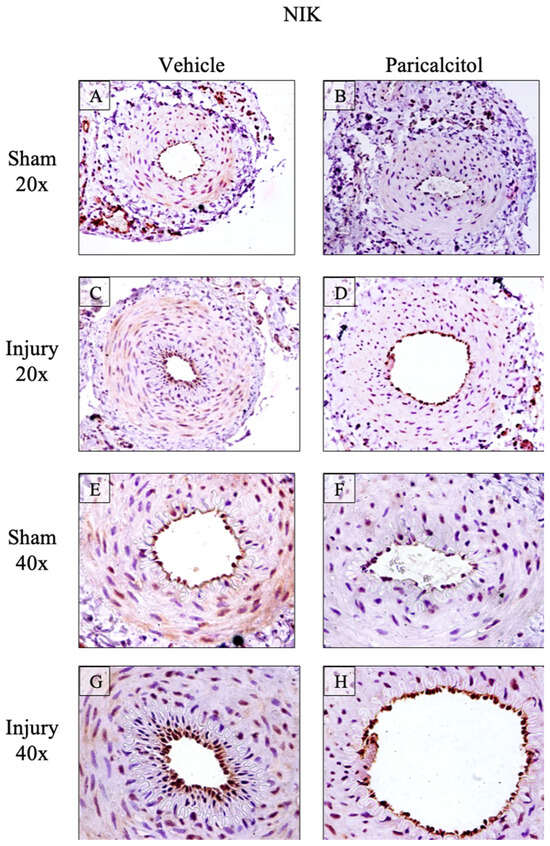 Increased femoral artery NIK protein expression: impact of paricalcitol. NIK expression in rat femoral arteries. Constitutive NIK expression is observed in vehicle sham arteries (A,E). In sham arteries of rats that received paricalcitol (B,F), NIK expression is lower in all layers of the artery. Injured arteries developing intimal hyperplasia (C,G) express NIK in endothelium and media. Paricalcitol decreased NIK expression in injured arteries (D,H).