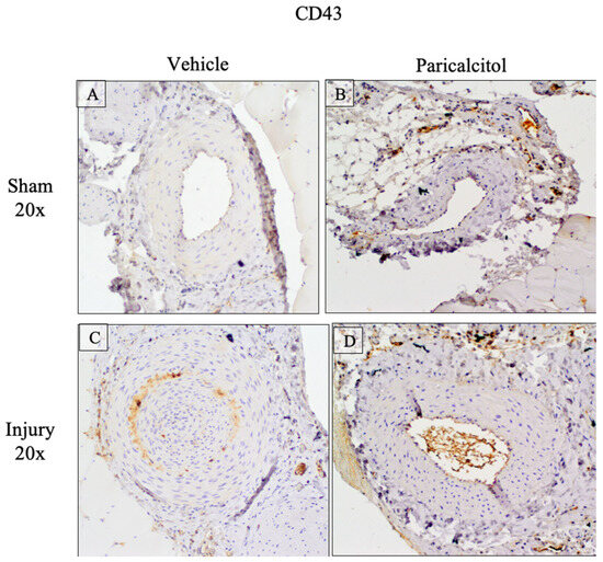 Increased femoral artery infiltration by CD43-expressing leukocytes: impact of paricalcitol. CD43 protein expressing leukocytes in rat femoral arteries (×20), either sham (A,B) or injured (C,D). CD43 staining showed leukocyte infiltrates in vehicle injured arteries (C). This infiltrate was lower in paricalcitol-treated injured (D) arteries.