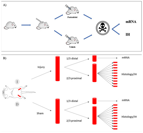 Experimental design. (A) Experimental model in rats. In each rat, the endothelium of the left femoral artery was injured by a vascular-guided scraping technique (injury artery). A similar procedure without scraping in the right femoral artery yielded sham artery controls. One group of rats received paricalcitol (750 ng/kg) and the other the vehicle for 2 weeks. Artery samples were evaluated 14 days after the intervention. Samples for mRNA, immunohistochemistry and histomorphometry were obtained from each arterial bundle. (B) Processing of arterial samples. After euthanasia, both femoral arteries were removed. The most distal third was used for molecular biology and protein studies. Histomorphometry and immunohistochemistry were performed in the proximal two thirds of the vascular bundle. To assess the degree of endothelial injury throughout the entire artery, this was divided into 10 consecutive sections that were stained and results averaged to yield the result of the sample.