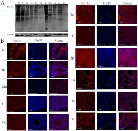The heart, liver, spleen, lungs, kidneys, stomach, uterus, testes, muscles, ovaries, and intestine were fixed and preserved in paraffin after an overnight fixation process. Tissue sections were subjected to incubation with primary antibodies (Pan la, PTM-1401, PTM Bio) at 37 °C for 2 h. Following this, the sections underwent three PBS rinses and were subsequently incubated for 1 h at room temperature with Alexa-labeled secondary antibodies (Invitrogen, Life Technologies) at a 1:500 dilution at 37 °C for 2 h. Nuclei were counterstained with DAPI (4,6-diamidino-2-phenylindole). Subsequently, the slides were visualized using a fluorescence microscope (Nikon Inc., Melville, NY, USA).