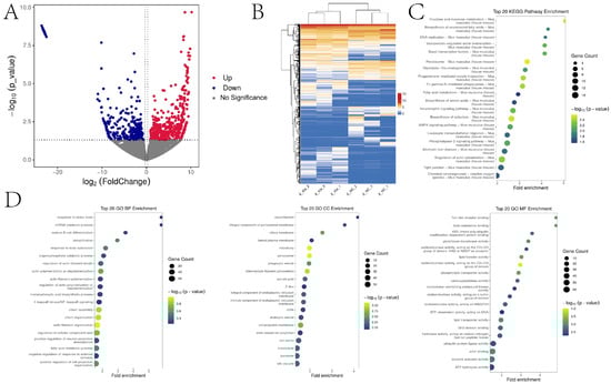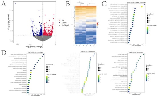 RNA sequencing was carried out by Geekgene Co., Ltd. (Beijing, China). Total RNA was extracted to construct cDNA libraries. Following a quality assessment, the libraries were combined based on their effective concentrations and the desired data output targets. Subsequently, sequencing was performed on the Illumina NovaSeq 6000 platform. Differentially expressed genes (DEGs) were identified using the criteria of log2(fold change) > 1.2 and p < 0.05. To gain insights into the functional implications of these DEGs, Gene Ontology (GO) and Kyoto Encyclopedia of Genes and Genomes (KEGG) pathway analyses were conducted. The raw sequencing data were deposited in the China National Center for Bioinformation under the accession code PRJCA021062.
