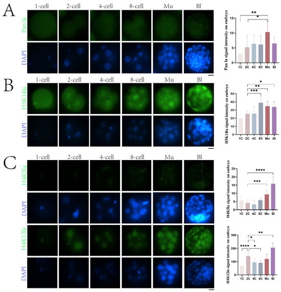 For oocytes and embryos, collected samples were fixed in 4% (w/v) paraformaldehyde (PFA) in phosphate-buffered saline (PBS) at room temperature for 20 min. Following fixation, samples underwent three washes with 1% BSA/PBS. Samples were permeabilized with 0.5% Triton X-100 and 1% BSA/PBS for 20 min, followed by three rinses with 1% BSA/PBS. The samples were blocked with 0.1% Triton X-100, 1% BSA/PBS for 30 min and incubated with primary antibodies overnight at 4 °C, including Pan la, H3K9la, H3K14la, H3K18la, H3K56la, H4K5la, H4K8la, H4K12la, H4K16la. Oocytes and embryos were incubated with secondary antibodies in the dark for 1 h and subsequently washed with 1% BSA/PBS for 5 min, repeating this process three times. Afterward, the samples were stained with DAPI for 10 min. Finally, the samples were mounted on slides, and immunofluorescence images were captured using a fluorescence microscope.