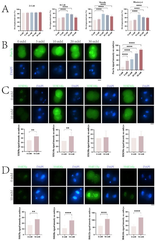 27]. Hence, lactate levels gradually decline while TCA cycle intermediates like α-ketoglutarate rise in embryos. Our data showed that 2-cell development rates were comparable across the five sodium lactate concentrations, indicating minimal impacts of sodium lactate at this stage. For 8-cell, morula, and blastocyst stages, development rates progressively increased from 0 to 10 mM sodium lactate and peaked at 10 mM, demonstrating appropriate sodium lactate levels can promote embryo cell division and differentiation to enhance developmental competence. This is likely attributed to elevated histone lactylation by sodium lactate, which in turn activates related signaling pathways and promotes gene expression and protein synthesis. In contrast, development rates declined from 10 to 30 mM sodium lactate, reaching the lowest level at 30 mM. This implies excessive sodium lactate inhibits embryo cell division and differentiation to impair developmental potential, either through drastic histone hyper-lactylation, which is detrimental for early embryos, or increased osmotic pressure, causing cell shrinkage.