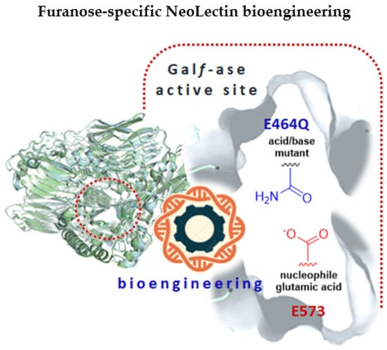 In this work, we have bioengineered, from Galf-specific carbohydrate-processing enzyme, through site-directed mutagenesis, an inactivated Galf-binding neolectin (GalfNeoLect) (Figure 1) []. As a probe to investigate and validate its binding specificity, we synthesised the bovine serum albumin (BSA)-based neoglycoprotein carrying the Galf, called GalfNGP. Using an integrated approach that combined enzyme kinetic assays, inhibition assays, and GLYctPROFILE® assays, we validated the GalfNGP and GalfNeoLect systems for their use to determine and study the Galf-specific recognition and binding.