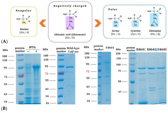 Based on mechanistic grounds of the GH2 family, the conserved residues represent the catalytic nucleophile (E573) and the catalytic acid/base (E464). Identified glutamic acid residues were expected to be the catalytic ones [] and, therefore, we focused our mutagenesis studies on the acid/base glutamic acid residue (E464) that has a crucial step in glycohydrolitic catalysis. Therefore, the acid/base catalytic residue (E464) has been specifically substituted to alanine (E464A), serine (E464S), cysteine (E464C), and glutamine (E464Q) (Table 3). The acid/base carboxylic acid residue (E464) has been replaced by the amino acids that have the residues of specific interest—briefly, that have no negative charge—and, subsequently, the hydrolytic mechanism rate should be attenuated whilst conserving the substrate specificity, in order to generate and explore their potential role as Galf-specific neolectins (Figure 3A). All of the Galf-ase mutant protein variants, except E464A, were produced and purified under the same conditions as wild-type Galf-ase. It appears that the E464A mutation probably affected the folding and stability of protein, resulting in the formation of insoluble protein aggregates (Figure 3B).