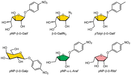Structural formulas of pNP-pyranosyl, -furanosyl, azido, or thioaryl substrates used for wild-type Galf-ase and GalfNeoLect substrate specificity screening.