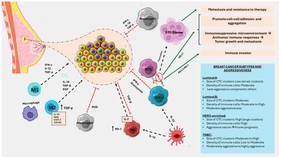Current research has demonstrated that the immune system plays a dual role in BC, as it has the ability to either inhibit tumor growth through immune surveillance or inadvertently promote tumor progression by fostering an immunosuppressive microenvironment []. The balance among these opposing forces hinges on the delicate interplay between immune cells and cancer cells, making the immunological profile a critical determinant of disease outcome []. The presence of CTCs, particularly those with a positive status (CTCs+), has been linked to metastasis and poor prognosis in BC patients. Recent research has highlighted the active role of the immune system in modulating the fate of CTCs [,]. During the initial stages of metastasis, various immune cells interact with CTCs, including neutrophils, NK cells, monocytes, macrophages, and T lymphocytes []. While the role of systemic immunity in cancer patients has been extensively explored in terms of clinical significance, the relationship between systemic immunity and CTCs remains unclear [,].