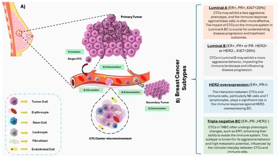 (A) This illustrative figure serves as a comprehensive overview of the interactions involving circulating tumor cells (CTCs) within the bloodstream. At its focal point, the graphic vividly depicts a solitary CTC, illustrating its circulation alongside other immune cells. The intricate dance of interactions between CTCs and the immune system is further highlighted, showcasing the dynamic engagement of these cells in the complex environment of the circulatory system. Additionally, the figure delves into the formation and structure of CTC clusters, providing a visual representation of the aggregations that contribute to the overall understanding of CTC dynamics. (B) Beyond the central depiction of CTCs, the segmented sections of the figure meticulously unravel the distinct immune dynamics within the context of four prominent breast cancer (BC) subtypes. For triple negative BC (TNBC), Luminal A, Luminal B, and HER2-overexpression, the figure succinctly elucidates the nuanced relationships that shape the impact of CTCs on disease progression. The metastatic process stages are depicted with green boxes, illustrating the key steps involved in metastasis facilitated by CTCs. These stages include intravasation, circulation, extravasation, and colonization, highlighting the role of CTCs in each phase of metastatic progression. Through visually compelling depictions and concise details, the graphic sheds light on how CTCs uniquely influence each BC subtype, offering valuable insights into the intricate landscape of breast cancer and its diverse manifestations.