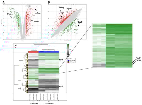 2.1. Microarray Analysis and Identification of Differentially Expressed Genes (DEGs) in the Derivation of ES-like Cells from SSCs