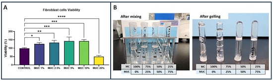 Viability test conducted with human fibroblast cells indicate that exposure to 1–10% NAC is beneficial but 20% NAC from commercially available solution does not offer further benefits (A) (n = 5, * p < 0.05, ** p < 0.01, *** p < 0.001, **** p < 0.0001). Commercially available solutions of NAC were mixed with 2% methylcellulose at different volumetric ratios to determine the suitable composition that would form a stable gel after incubation at 37 °C (B).