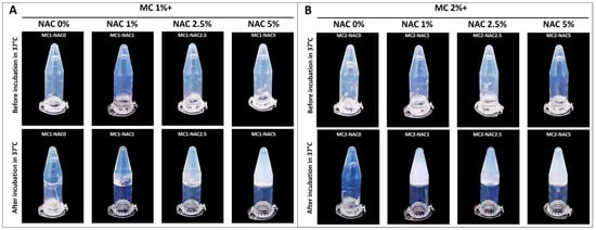 Different compositions of NAC hydrogel tested with lowered concentrations of pure NAC. Results indicate that NAC can be combined with 1% (A) to 2% (B) MC at a 50% volume ratio to create an NAC hydrogel capable of gelling at 37 °C.