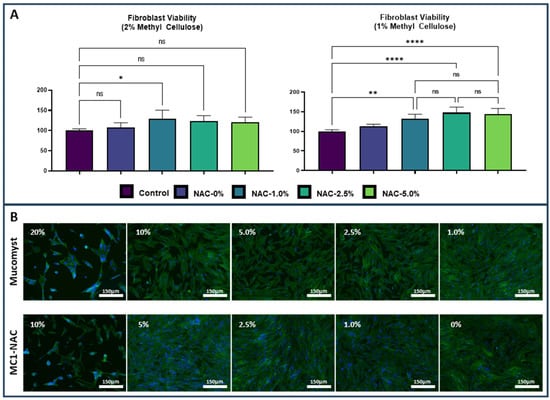 Before formulating NAC hydrogels by combining N-acetylcysteine (NAC) with methylcellulose (MC), in vitro cell viability was tested using different dilutions of commercially available NAC solution (Mucomyst). In vitro testing with the commercial NAC solution indicated that beneficial effects on viability are observed from 1–10% NAC when tested with fibroblast cells. While no significant difference among 1–10% NAC was observed, viability steeply dropped when fibroblasts were exposed to the highest concentration (20%) of NAC (Figure 1A).
