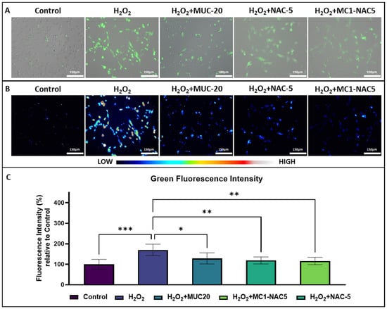 Micrographs of fibroblasts cells showing green fluorescent ROS after exposure to different treatments containing NAC (A). Green channels with modified LUT for improved visualization of green fluorescence from intracellular ROS (B) (scale bar = 150 µm). Analyses of the fluorescence intensities (C) show that all treatments are able to reduce ROS in H2O2-treated fibroblast cells (n = 6, * p < 0.05, ** p < 0.01, *** p < 0.001).