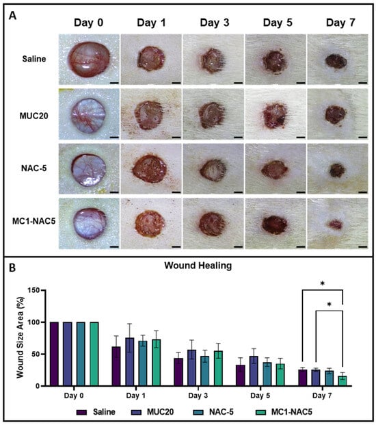 Macro images of the wound beds routinely treated with either saline, MUC20, NAC-5, or MC1-NAC5 (A) (scale bar = 2 mm). Results of the wound size analysis (B) indicate that application of the MC1-NAC5 resulted in a significantly reduced wound at day 7 but did not show any significant reduction within the 1-week observation period (n = 4, * p < 0.05).