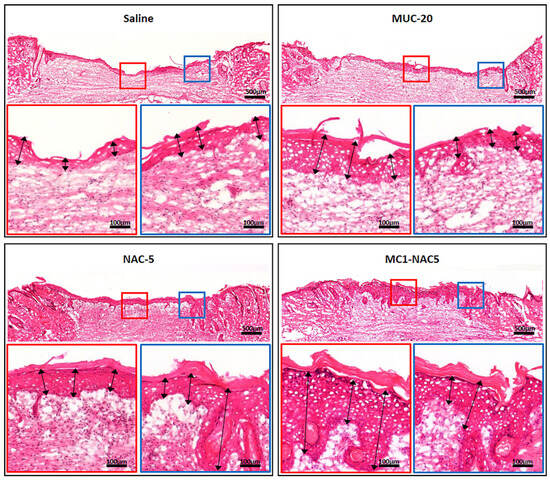 H&E-stained tissue sections of the wound bed from the different treatment groups show substantial difference in tissue development (scale bar = 500 µm). Wounds treated with the different N-acetylcysteine solutions (MUC-20/NAC5/MC1-NAC5) resulted in thicker epidermal tissue formation (black arrows). MC1-NAC5 resulted in substantially thicker epidermal tissue formation within the central wound surface (red box) and along the wound margin (blue box) (scale bar = 100 µm).