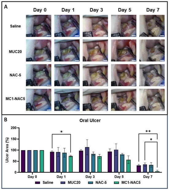 The effect of routine application of NAC hydrogel on oral ulcers was thoroughly evaluated utilizing an animal model of chemically-induced oral ulcers. Throughout the 1-week observation period, the size and overall condition of the oral ulcers were meticulously assessed, with photographs being captured for documentation purposes. The findings from the oral ulcer size evaluation (as depicted in Figure 7A) elucidate a noteworthy reduction in ulcer size with the consistent utilization of MC1-NAC5 in contrast to all other experimental groups. Interestingly, the application of an equivalent concentration of NAC (5%) demonstrated a marginal improvement in oral ulcers; however, it failed to exhibit statistical significance compared to the control group. Conversely, the routine application of 20% Mucomyst yielded highly variable outcomes, showcasing minimal deviation from the control group (as illustrated in Figure 7B).