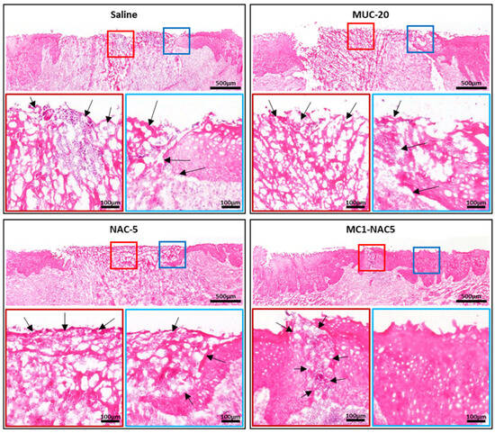 Histological analysis of the extracted oral mucosal tissue further reveals the discrepancies in tissue regenerations among different treatment regimens (scale bar = 500 µm). While all samples retained substantial fibrous tissue formation within the papillary layer (black arrows), only MC1-NAC5-treated tissue showed full closure of mucosal layer (central ulcer surface—red box; ulcer margin—blue box; scale bar = 100 µm).