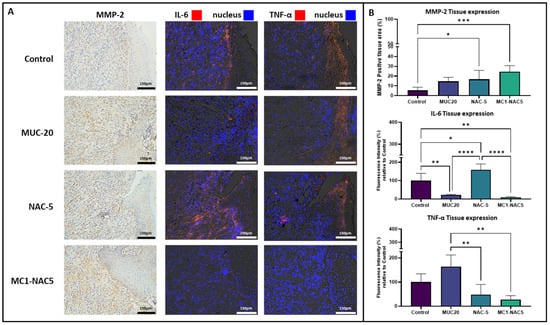Immunostained sections of the mucosal edge of the oral ulcer from the groups show variable tissue expression among the different NAC-based treatments (A) (light microscope image scale bar = 150; fluorescence image scale bar = 150 µm). Image analyses based on color coverage and fluorescence indicate that oral ulcers treated with MC1-NAC5 have higher expression of MMP-2 and lowest expression of IL-6 and TNF-α (B) (n = 4, * p < 0.05, ** p < 0.01, *** p < 0.001 **** p < 0.0001).