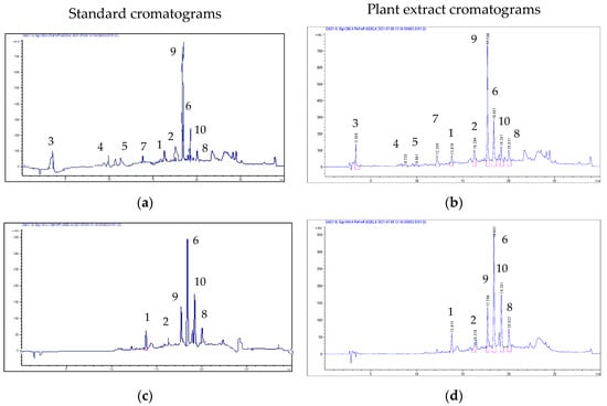 Chromatograms of phenolic compounds identified in PV extract: (a) standard chromatogram at λ = 280 nm; (b) plant extract chromatogram at λ = 280 nm; (c) standard chromatogram at λ = 340 nm; (d) plant extract chromatogram at λ = 340 nm. See Table 1 for the identity of the compounds.