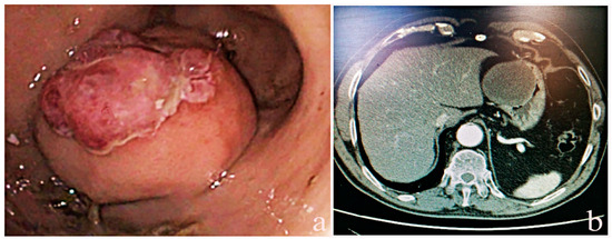 Gastric plexiform fibromyxoma case: (a) endoscopic appearance of antral mass with surface erosion/ulceration; (b) axial CT scan showing the lesion in which the body of the stomach is involved.
