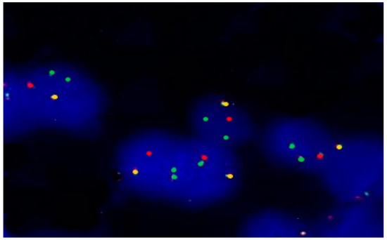 Interphase dual-color FISH was performed on tumor sections using the break-apart approach to investigate the prevalence of the MALAT1-GLI1 fusion. By using differentially labelled FISH probes, which were mapped to the GLI1 and MALAT1 genomic loci, the presence of the MALAT1-GLI1 fusion was confirmed in this case. The BAC probes used were the SG-labelled RP11-472D15 and the SO-labelled RP11-181 L23, covering the MALAT1 and GLI1 genes. FFPE 3.5 µm sections were taken from the case under investigation and subjected to interphase FISH in order to screen for rearrangements involving the genes of interest. Tissue sections were processed using the ZytoLight FISH Tissue Implementation Kit (Zytomed Systems, Berlin, Germany) in combination with differentially tagged BAC probes, SpectrumOrange (SO) and SpectrumGreen (SG), covering the GLI-1/12q13 and MALAT-1/11q12 locus regions, according to the manufacturer’s instructions. FISH was performed according to standard procedures. FISH images were captured using a CytoInsight GSL 10 fluorescence microscope (Leica Biosystems, Solihull, UK) with DAPI, SpectrumGreen, and SpectrumOrange optical filters and a 63× objective (oil, 1.30 aperture; Leica, Solihull, UK) equipped with the CytoVision digital image analysis system. Tissue was scored and considered positive if >25% of at least 200 cells showed evidence of cleavage or fusion. Excluded from evaluation were nuclei with an incomplete set of signals.